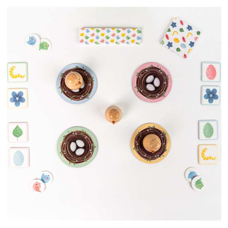 Un joc drăguț și accesibil pentru cei mici, ce combină observația rapidă și memoria: jucătorii încearcă să potrivească elementele de pe plăcuțele lor cu cele de pe cartea-provocare și să prindă primul un pui de pasăre. Ideal pentru copii de peste 3 ani, jocul conține două niveluri de dificultate care evoluează odată cu jucătorii. Partide rapide, pline de tandrețe și culoare.