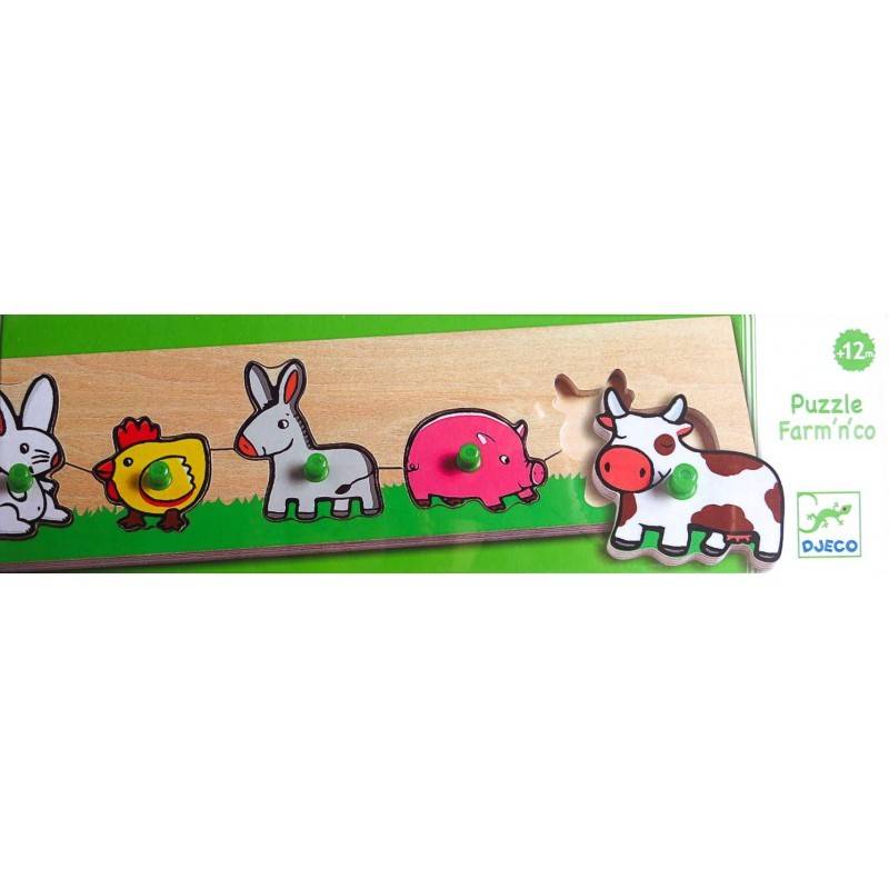 Puzzle de lemn cu 5 animale de la fermă, cu butoane atașate fiecăruia, pentru a fi ușor de mânuit de cei mici.